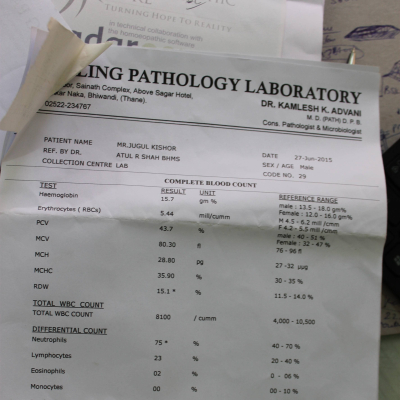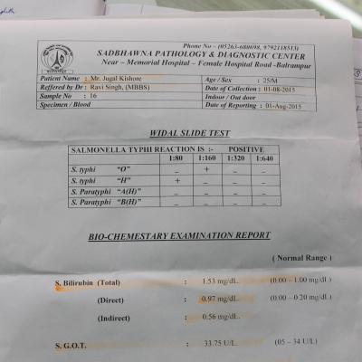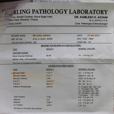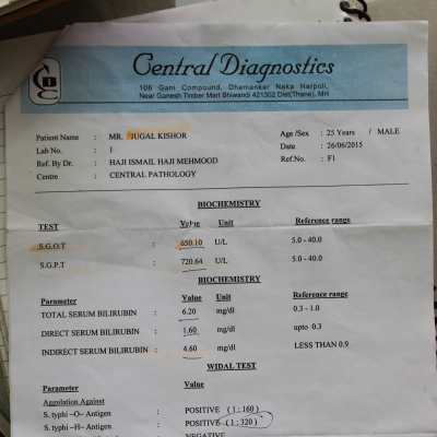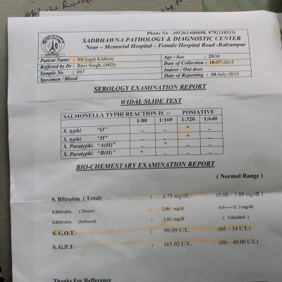 He came to consult Dr. Ravi on 1st August 2015 with his typhoid and Jaundice test report. His serum bilirubin, S.G.O.T & S.G.P.T test value was approximately normal. From 650 & 720 it was decreased to 33 and 36 which was almost normal. He was totally recovered in just 1 month of starting Dr. Ravi treatment. He reported that sometimes he feel pain and whenever some physical work is involved there is increase in pain. Dr. Ravi suggested to continue treatment for better recovery. He continued treatment for few more days to avoid recurrence. Once he was totally cured he went back to Mumbai.