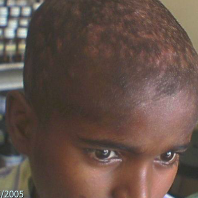 A young boy has been referred to Dr.Ravi at his Balrampur clinic by a local doctor who tried hard to cure this poor fellow for a pus-filled scalp condition. This condition is common in malnourished and poor children in villages, especially who had been in bad hygienic condition. Initially, it seems a scalp condition called as Tinea capitis in which fungus grows on the scalp but this condition either presented in bad condition or in a mixed condition so probable diagnosis made by Dr. Ravi was scalp folliculitis as hair root seems inflamed with the formation of many pimples and pus was mixed with blood. The whole scalp was covered with thick yellow crust. In homeopathy, the name of the disease matters little in the treatment. The patient is always treated according to their individual symptoms and makeup of the patient including their personality. Anyhow treatment of boy has been started on 15/05/2015 with the method of medicine transmission through hair.